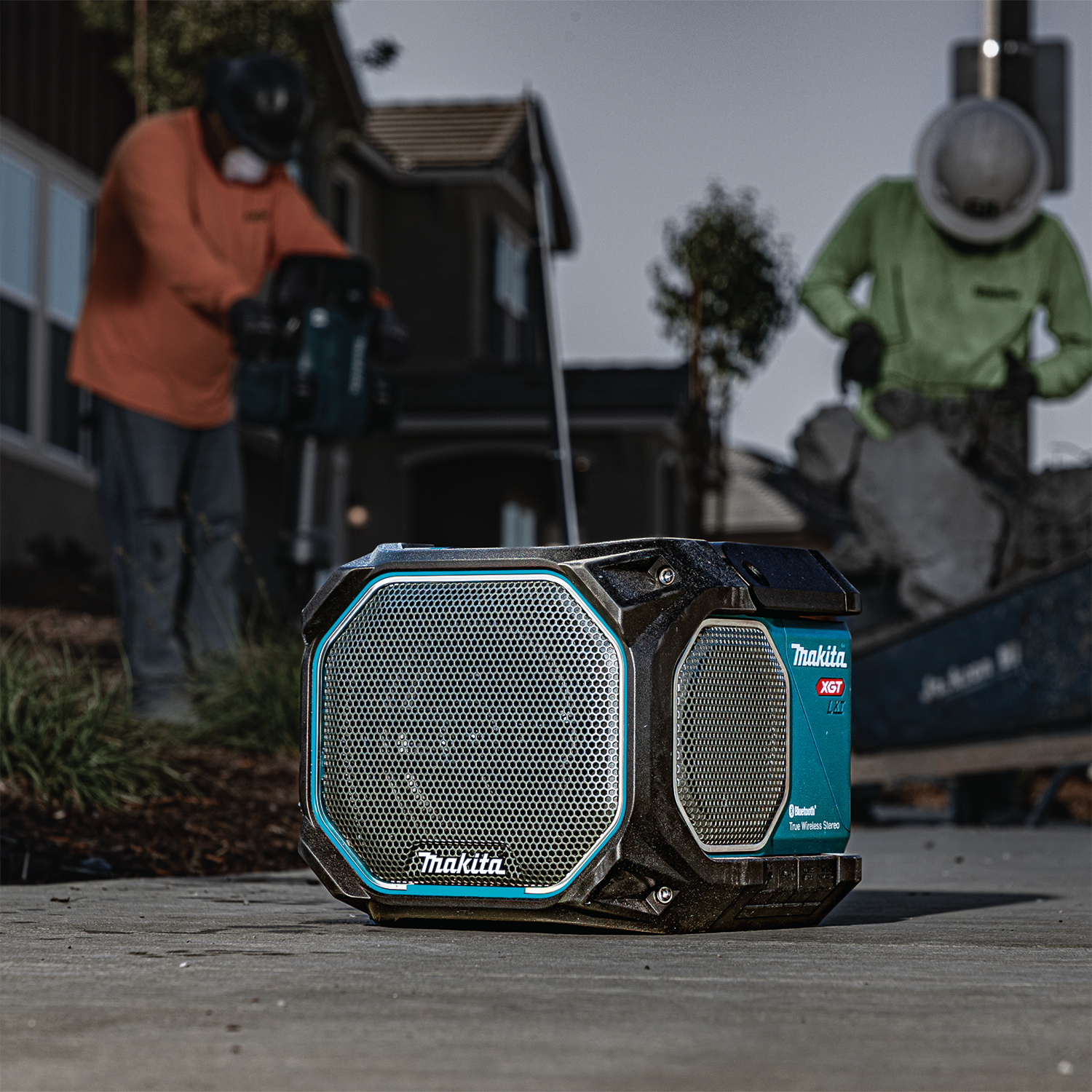 This versatile sound system is compatible with 40V Max XGT, 18V LXT, or an AC adaptor, delivering high-quality sound with deep bass. It features an equaliser that allows you to adjust the sound mode to match the music genre. Designed for durability, it is IP65 rated for dust and water resistance. Additional features include a built-in smartphone stand, USB charging port for mobile devices, an Aux in port, a built-in microphone amplifier, and Class 1 Bluetooth connectivity with a range of up to 100 meters. Plus, you can connect up to 10 units together for synchronised sound.