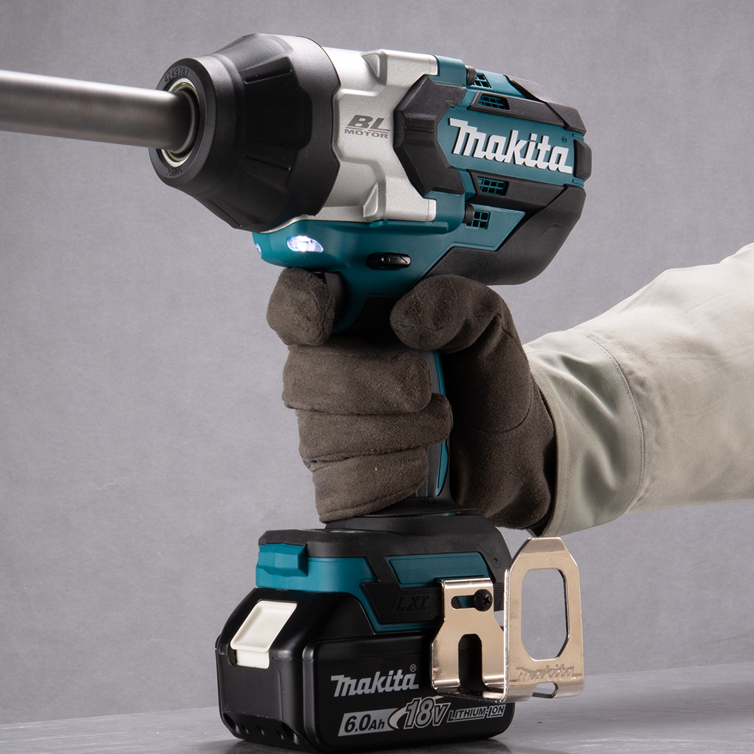 Equipped with a long anvil and a 19mm (3/4") square drive featuring a C ring with a hole, making it ideal for heavy-duty fastening tasks. Designed for maximum control and efficiency, it offers variable speed control via the trigger and an electronic 4-stage impact power selection, allowing users to tailor power and speed to the application. The Full Speed Mode enables the tool to reach maximum speed with reduced trigger pull effort, helping to reduce user fatigue during prolonged use. Constant speed control maintains stable torque throughout the battery charge (excluding reverse and maximum forward rotations), ensuring consistent performance. Additional features include twin LEDs with pre-glow and afterglow for improved visibility in low-light conditions.