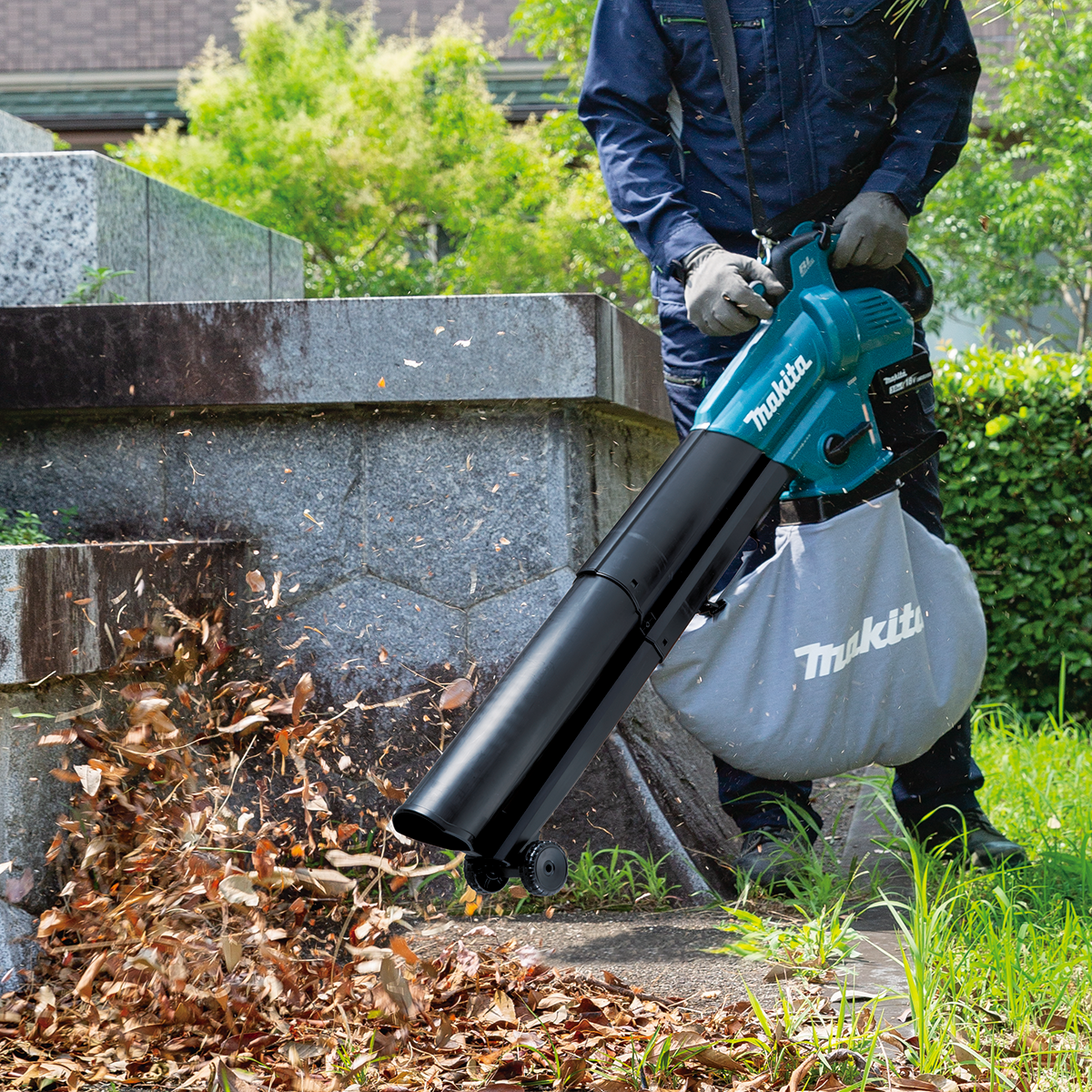 The versatile DUB187 Brushless LXT Blower, which features both blower and vacuum functions, has a variable speed trigger control plus a cruise control for ease of operation. In blower mode the DUB187 produces a maximum air volume of 4.2 m3 /min with an air velocity of up to 64m/sec. As a vacuum to pick up leaves and garden debris, the DUB187 has a maximum air volume of 6.1 m3 /min, benefits from a 25 litre collection bag and features a metal shredder blade on the fan for mulching. For easy and comfortable use, the DUB187 also features top and rear handles as well as a shoulder strap and two casters on the blower/vacuum nozzle for ease of movement.
