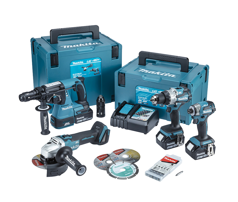 Includes: DHP489 Combi Drill, DGA504 Angle Grinder, DHR243 Rotary Hammer, DTD173 Impact Driver